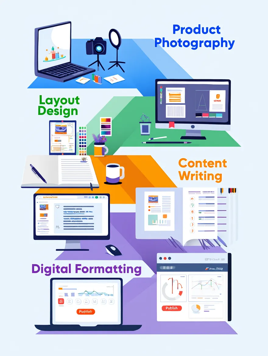 Designing and developing a visually appealing and organized digital product catalog (non-interactive PDF/web view).